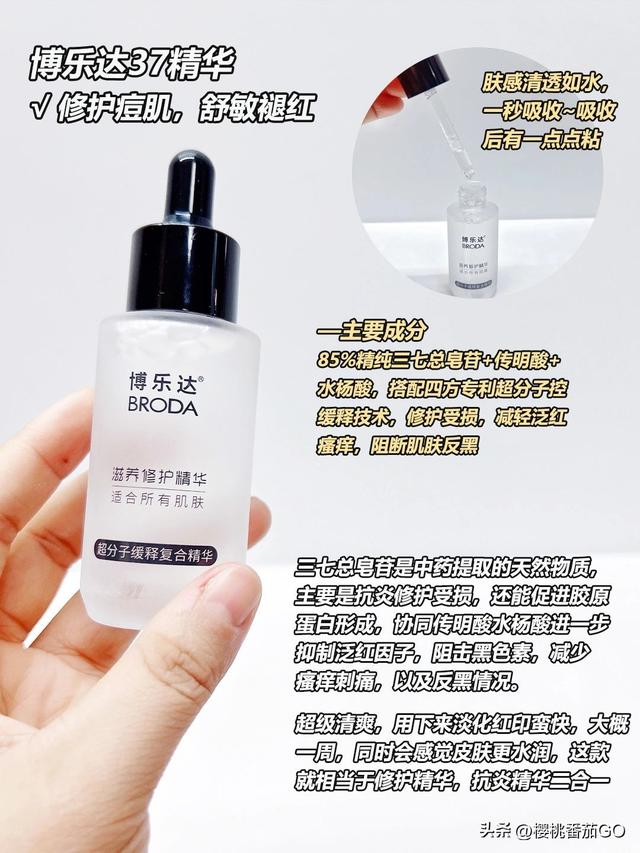 ✅那痘痘褪去后除了修护,也会留红痘印,日常搭配油橄榄抗精华,或专门护理痘肌的博乐达37精华,含有85%三七总皂苷,抗y修护受损肌肤的同时促进胶原再生,减轻敏感瘙痒,复配传明酸水杨酸,进一步减少因子,褪红淡印蛮快,减少反黑均匀提亮,还能提升皮肤含水量,恢复健康水润。