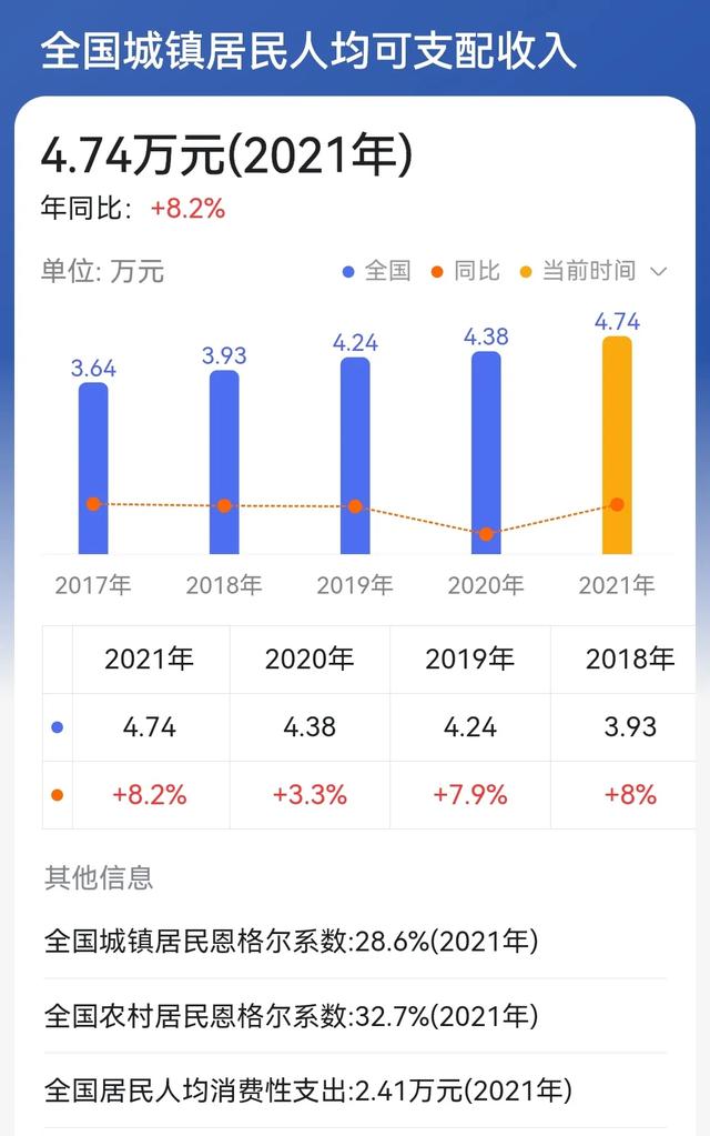 你的收入刚刚超过2021年全国城镇居民人均可支配收入的平均水平,2021年全国城镇居民人均可支配收入为4.75万元。你一个人过的话,你达到了平均数。如果你有老婆孩子再和你平均一下,那么很不好意思,你已经进入贫困户行列了。要是这样靠存款消费,就不要考虑财务自由的事了,能吃饱就不错,还是早点洗洗睡吧![我想静静]