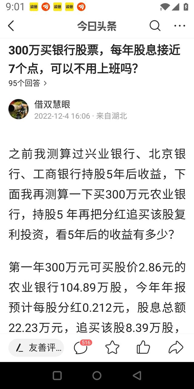 平均每年大约有63.29万元的收益,应该说已经达到财务自由的条件,而且够你或你的后代人N年享用。股息率在7%左右的银行股还有北京、交通、兴业、中国银行等。