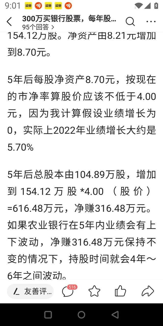 5年后总股本由104.89万股,增加到154.12万股*4.00(股价)=616.48万元,净赚316.48万元。如果农业银行在5年内业绩会有上下波动,净赚316.48万元保持不变的情况下,持股时间就会4年~7年之间波动。