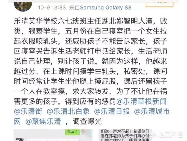 还有报道说郑智明猥亵女学生的行为变本加厉:“乐清英华学校六七班班主任湖北郑智明人Z,败类,猥亵学生,五月份在自己寝室把一个女生拉起衣服咬乳头,还威胁孩子不能告诉家长,孩子回寝室哭告诉生活老师打电话给家长,生活老师说自己处理,别让孩子说。就因为这样,他越来越过分,在上课时间摸学生乳头,私密处,课间时间经常让学生坐他腿上摸屁股,课后还留孩子一个人在教室摸。” 实在看不下去了。