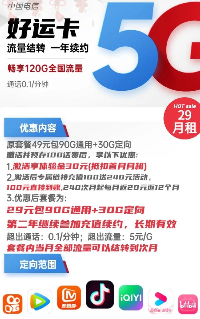 电信现在推出了2款29米的套餐,20年套餐包含100G其中70G通用流量➕30G定向流量(流量不能结转),另一款120G其中90G通用流量➕30G定向流量(流量可以结转),通话都是0.1/分钟,定向流量可以用在阿里系列,腾讯系列,抖音和快手系列,这两款应该可以满足楼主的需求