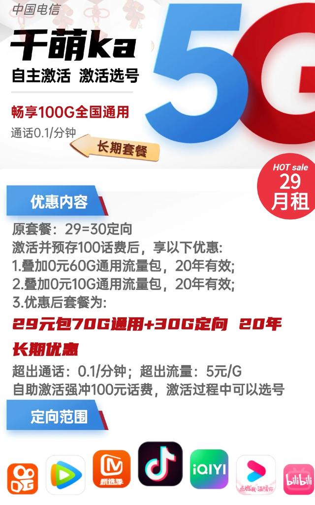 电信现在推出了29米20年套餐,流量有100g,其中70g通用,30g定向,定向包括头条系,腾讯系,网易系和快手系定向流量,应该可以满足你的需求
