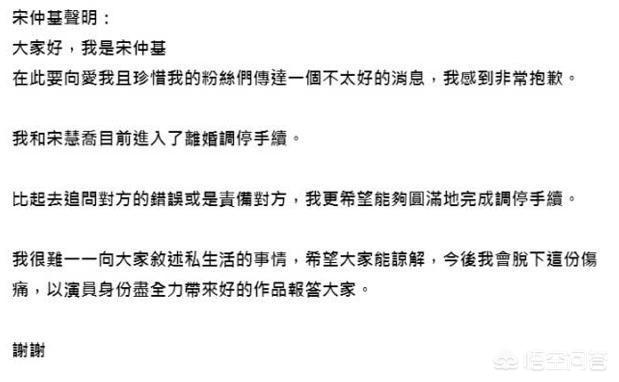 宋仲基在今天突然公布的离婚声明,并向宋慧乔申请离婚调解,宋仲基所发表的离婚声明中没有明确提出二人离婚的原因,只表示会尽快摆脱目前的伤痛,以更好的作品来报答粉丝和关心他的人。