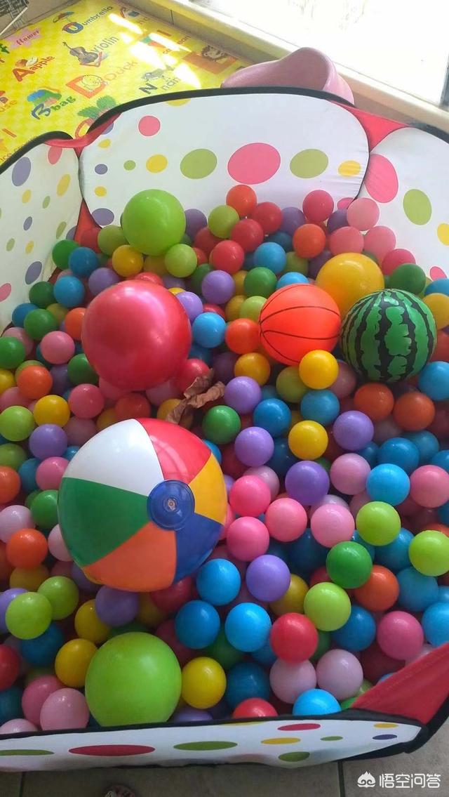 5、各种大大小小的球。我宝宝经常扑倒在里面,一个人可以玩很久。海洋球可以边玩边认颜色和数字,边和宝宝一起拿球边说一个蓝色的球或三个红色的球,也可以让宝宝听你的指令拿出正确的球。经常这样玩,过一段时间就会发现宝宝对颜色和数量就有了很大的认知了。大的球我经常用来和她一起玩滚球和抛接的游戏。