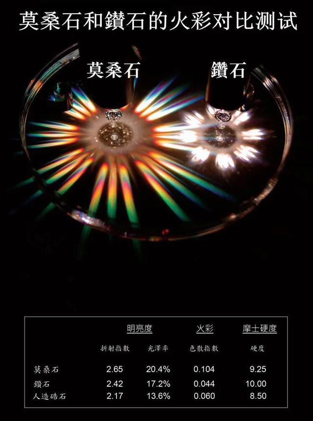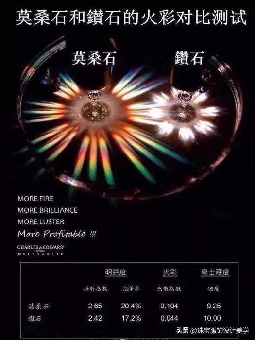 这种人工合成的碳化硅,因其与天然钻石有着非常相似的一些属性:高折射率、比钻石更好的光泽度、高于钻石2.5倍的火彩、与仅次于钻石的硬度。以下配图对属性的具体数值有说明。