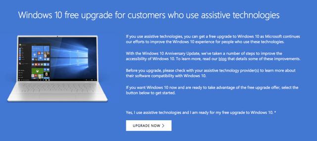 其实,今天外媒TechSpot实测后发现,虽然过了一年的免费升级期,但目前Windows 10仍旧可以通过“面向辅助技术用户专门升级页面”和“输入正版Windows 7/8.1密钥激活”来享受免费福利。