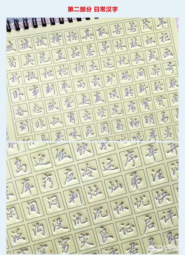 每次吃完饭以后,我都会练十多分钟的这种凹槽板。时间用的虽然不多,但是每一次练的时候我都会认真的感受,每一个笔画的走向,横折应该在哪个地方折,捺应该怎么写,我都会非常认真的想,非常认真的记。所以后来书写的进步非常的大。后来我女儿学书法的时候,她的书法老师教了她一个非常好的方法,就是每次写完一排以后一定要对照范字,看一看自己的这排字里哪几个字写得最像范字。在对照的过程当中,就建立了一种有美感的字应该怎么写的概念。我觉得这也是练字能够突飞猛进的好方法。