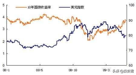 美指不断的创新高,美元不断的升值,则会影响黄金和石油等价格连续的走低,投资者的将不再寻求避险,进而纷纷涌现风险资产股市,股价被不断的推高,而有色金属类股票将会下降。