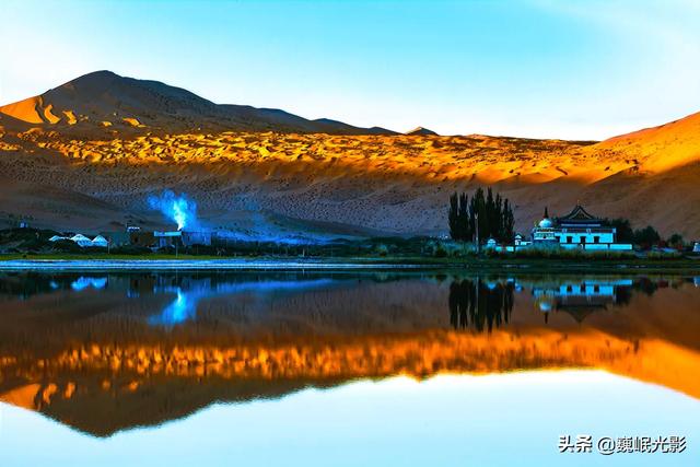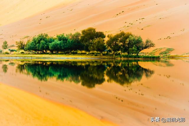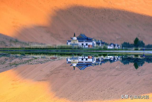 庙海子是个神奇的湖,湖周围是沙山。蒙语称为苏敏吉林,意思是“有庙的海子”。海子边有座藏传佛教寺庙,建于1755年。这座白墙金顶汉藏混合的建筑背靠沙山,面朝湖水,庄严肃穆,幽静典雅,被称为“沙漠故宫”,是巴丹吉林沙漠的地标,亦是牧民心目中神圣的殿堂。寺外还有一座白塔,在黄沙蓝水间显得格外抢眼。传说寺庙是汇集了身怀绝技的能工巧匠,采用了雅布赖山和天山的石头做基石和栋梁而建成,是沙漠中唯一从始建保存至今的寺庙。这个从不曾枯竭,也不曾被风沙掩埋的海子,当插着地平面的夕阳映红了沙山,连同湖岸婆娑的柳树,与古庙一起静静地倒映在水中,那海市蜃楼之景,如梦似幻之彩,定会让你惊叫不已。
