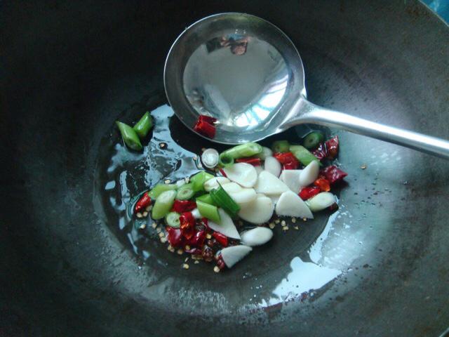 3;锅中加油烧热放入蒜末,干红辣椒段爆香