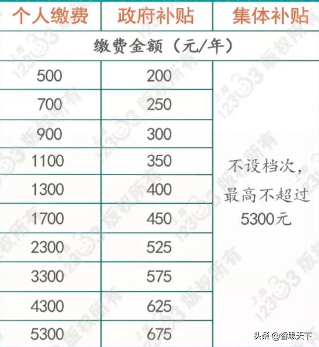 比如个人一年缴费500元,那么政府就会补贴200元,如果个人缴费4300元,那么政府就补贴625元。也就是说,个人缴费越高,政府补贴就会越高。