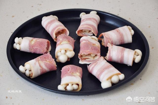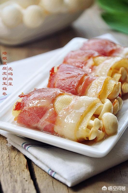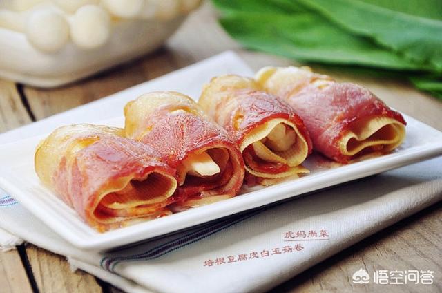 【培根豆腐皮白玉菇卷】 材料:培根5片,豆腐皮半张,白玉菇1盒。 豆腐皮要买最薄的那种,这样才能多卷点蘑菇,但是也别贪心,卷卷小些才能一口一个。 无须任何调味料,培根的独特味道就足够。只是要尽量买大超市的培根,品质好颜色正口感佳。