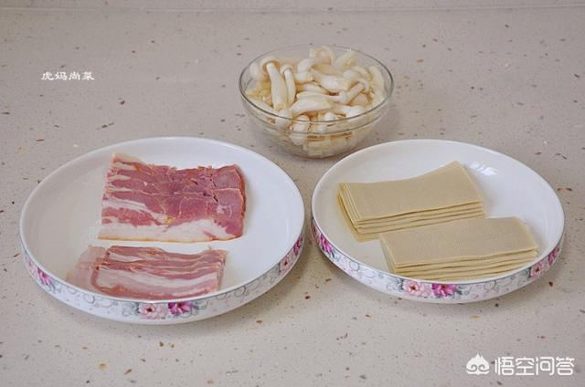 做法: 1.培根对半切开成两段;豆腐皮切成培根一样的大小宽窄;白玉菇去根蒂后掰散,洗净。