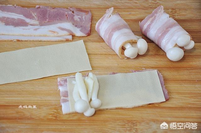 2.取半片培根,上面铺豆腐皮,再放几根白玉菇,然后卷起即可,收口向下摆放。 白玉菇有的底部比较胖,可以将杆部撕开,但不要撕断掉,这样既能保持蘑菇的原状还易熟。