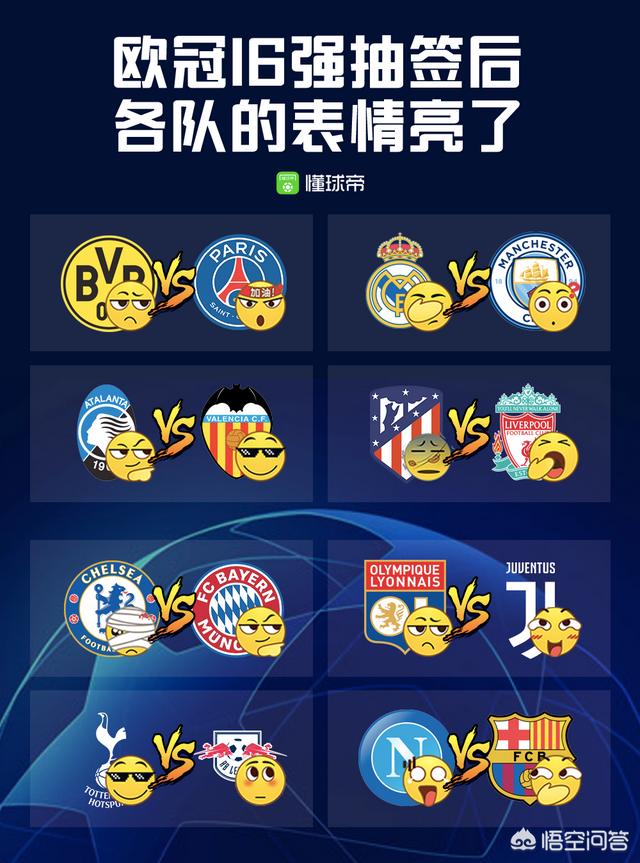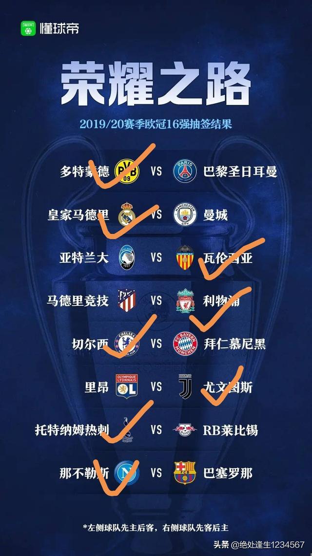 本届欧冠十六强的角逐,已经在两天前抽签完毕。本次抽签结果,用懂球帝的海报,就是这么个状态: