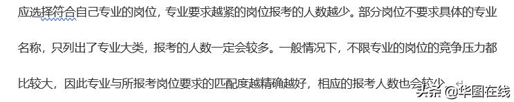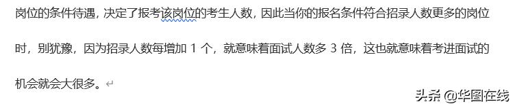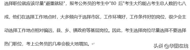 不耽误时间,来点干货吧~就是报名时尽量选择条件苛刻的岗位,这样竞争对手就会少很多。无限制的岗位,往往也会有无限制的人数,里面往往有考霸。