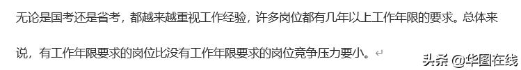 五、工作经验。无论是国考还是省考,都越来越重视工作经验,许多岗位都有几年以上工作年限的要求。总体来说,有工作年限要求的岗位比没有工作年限要求的岗位竞争压力要小。