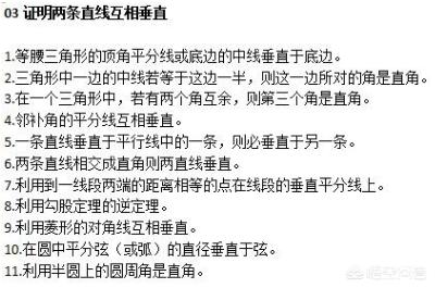 我们可以将那么多内容归类为:三角形相关的(1,2,3,8),直线相关的(相4,5,6,7),以及圆相关的(10,11),菱形相关的(9)。通过对内容进行归类,我们很容易了解在不同几何图形中垂直的证明方法。其他的证明也是如此,多进行归类,记忆从来都不应该是数学学习的障碍。