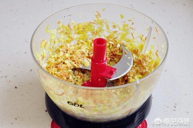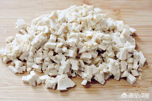 小贴士:豆腐不能放入切菜器里面一起搅打,那样会碾成泥,馅料的味道就不好了,所以得用刀切成小粒再拌到一起。