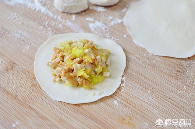 将小面剂子挨个的按压扁,打圈擀成中间厚四周薄的饺子皮,然后在饺子皮中间放入适量的馅料。