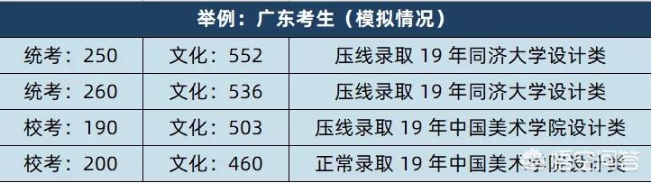 举个例子:假设你是一名广东考生,联考考了 260 分(这个分数是去年广东联考的前 100 名),想上同济大学的设计类,那你的文化分最少需要达到 536 分;假如联考考了 250 分,那你的文化分最少也要 552 分。