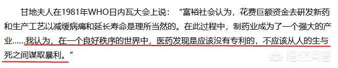 用甘地夫人一句话解释:我认为,在一个良好的世界秩序中,医药发现应该是没有专利的,不应该从人的生与死之间谋取暴利!