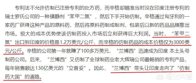 印度商人巴伊·莫汉·辛格仿制了当时没在印度注册专利的瑞士罗氏公司的一种镇静剂 “ 苯甲二氮 ”,他将药品重新包装,换了个新名字,比专利药低好几倍的价格放入市场销售。