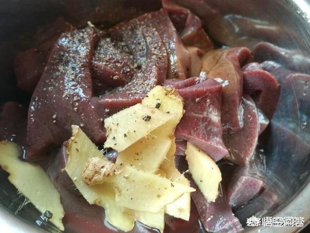 步骤二:浸泡完成后,将猪肝切片,再用水浸泡一下,抓干净后,用姜、酒、酱油,并撒上黑胡椒,入味20分钟左右即可。