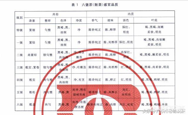 3、等级:“六堡茶(散茶)按感官品质特征和理化指标分为特级、一级至六级共七个等级。”“六堡茶(紧压茶)按感官品质特征和理化指标分为特级、一级至六级共七个等级。”