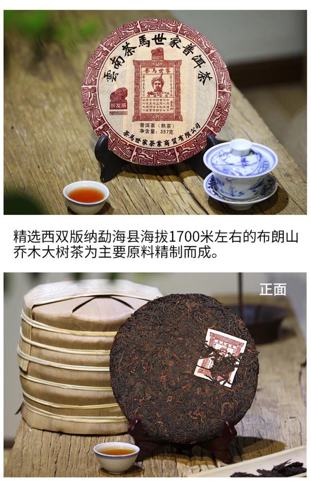“普洱茶(熟茶)是以符合普洱茶产地环境条件的云南大叶种晒青茶为原料,采用特定工艺、经后发酵(快速后发酵或缓慢后发酵)加工形成的散茶和紧压茶。其品质特征为:外形色泽红褐,内质汤色红浓明亮,香气独特陈香,滋味醇厚回甘,叶底红褐。”