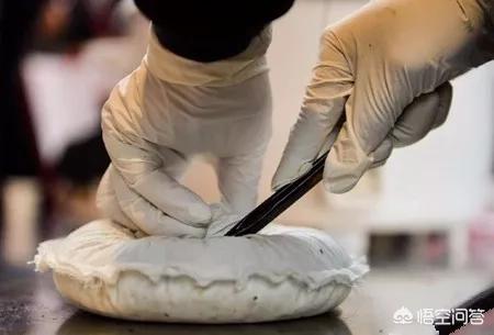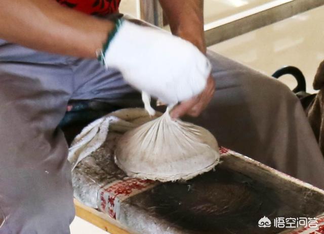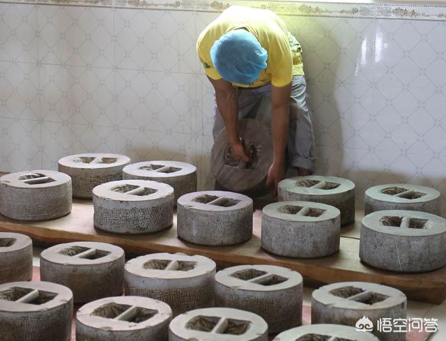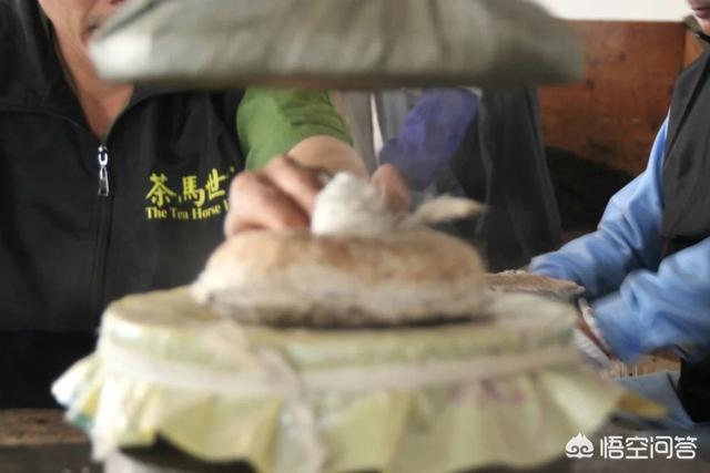 它是传统的人工压制,先用布袋装茶,布袋打结的那个位置,就是窝成型的地方,然后再用石磨压制,压紧后,把布袋拿下,最后进行烘干等步骤,普洱茶泡饼就完成了。