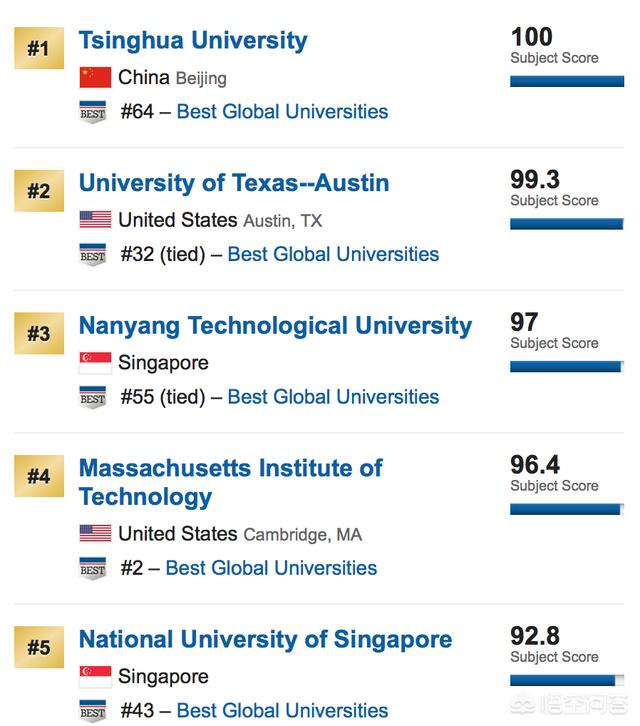 第二名到第五名的学校,分别是德州大学奥斯丁分校,南洋理工大学,麻省理工学院,新加坡国立大学。在排名前五的大学中,新加坡这么一个小国家,一点人口,一小块土地,竟然独占了2个席位。亚洲表现不错,占了3个位置。