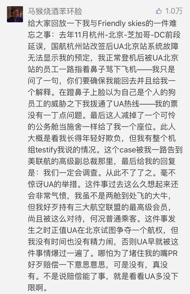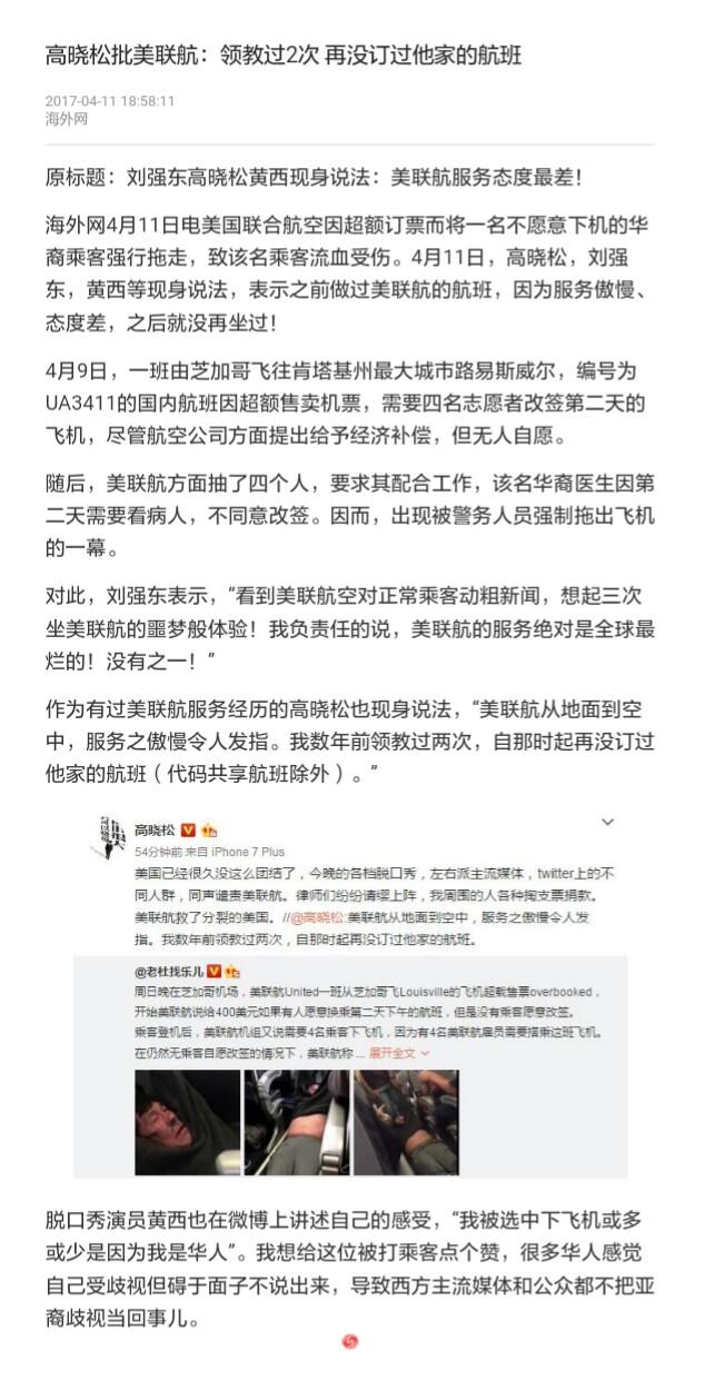 后来由于工作的变动,我也很少再去美国,并没有太多去关注美联航的情况。直到今天,看到微信朋友圈、微博和各大新闻网站上刷爆的华裔乘客在美联航遭暴打流血并被强制带离这一新闻,大家就可以对比一下,美联航是用怎么样的双重标准来对待乘客和自己的。