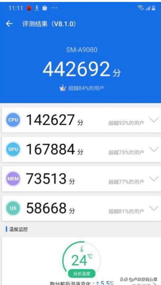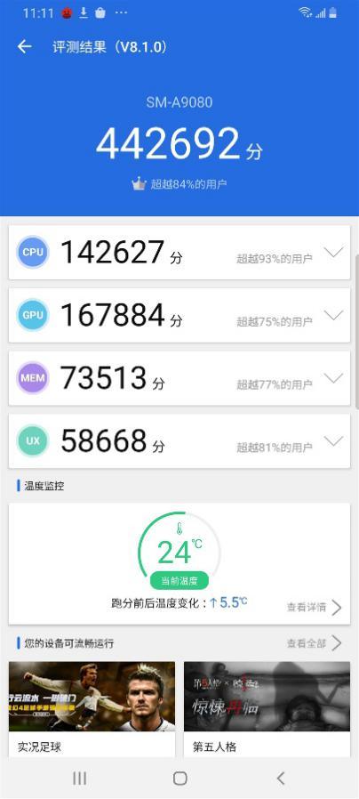 从上面三星Galaxy A90 5G版手机的跑分截图中可以看到,A90 5G版的跑分达到了44万+,其中CPU得分142627,已经超越了市面上大部分旗舰机型,丝毫没有拖“安卓机皇”的后腿符合三星“安卓机皇”的一贯作风,这样的配置即使多任务同时处理或者玩大型的《和平精英》以及《王者荣耀》都没有任何压力,丝毫不见卡顿现象。