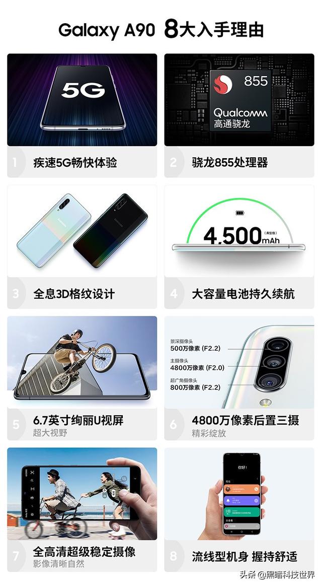 三星A90-的购买理由:骁龙855处理器、支持5G网络通信、4500mAh电池、4800万后置三摄、3200万前置自拍镜头、6.7英寸超大全面屏。