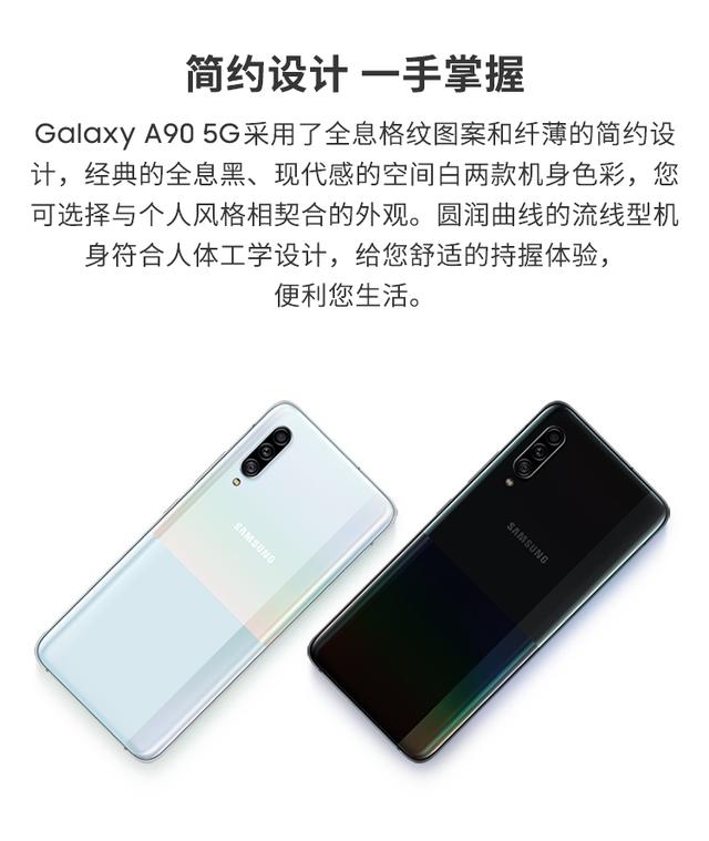 三星A90 5G搭载的是后置三摄,其中一颗4800万像素的主摄像头,拥有一个F/2.0的大光圈,成像素质极佳。一颗800万像素的超广角摄像头,在拍摄更为宽阔的画面,这颗大角度的摄像头能够发挥广角的优势。一颗500万像素的景深摄像头,在拍摄时更好的突出主体。前置一颗3200万像素的摄像头,无论是在什么样的环境下都能够拍摄出靓丽的自拍照片。在续航方面,这款三星A90 5G版搭载了一块4500毫安的大电池,能够有效地保证手机长时间的使用,具备出色的续航能力。这款三星A90 5G版不只是在性能上做了升级,同时在外观设计上也下了不少功夫,手机采用圆润的流线型设计,手机在日常使用中有舒适的握持感,还支持屏下指纹解锁。