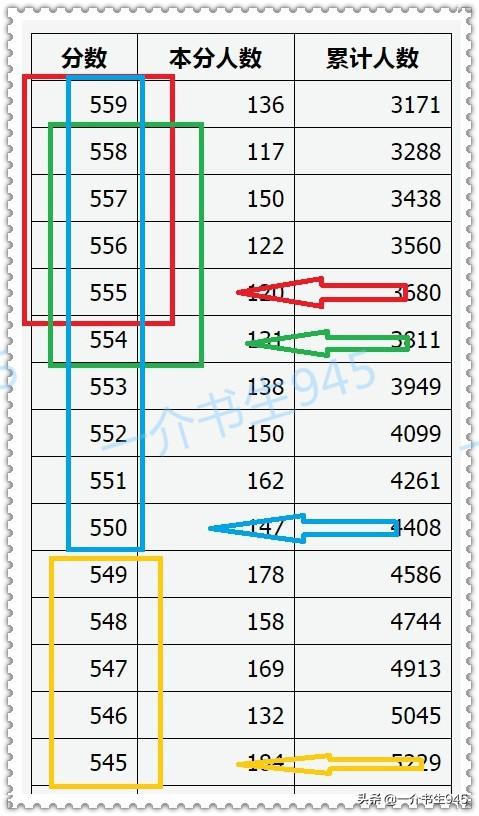 这是某省实际的一分一段表,如果某省的一本院校招生人数为3580人(在此,书生将招生计划人数与划线人数合二为一,不考虑投档比例为1:1.05的情况),那么,一本线就正好是555分;而如果一本院校的计划招生人数为3811人,一本线就是554分;而如果招生人数为4408人的话,一本线则成为550分。