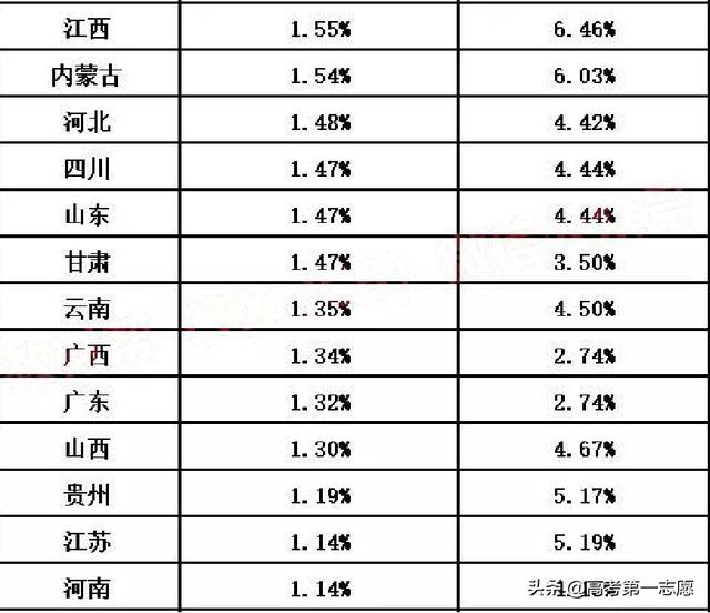 我们最为关注的是两个指标,一个是本地区本科院校的占比情况,一个是外地院校本科在本省的招生情况。制约后者的往往也是本省的教育情况,如果本省的基础教育好,则外地本科院校倾向于向本省多投放名额,如果基础教育薄弱,除政策照顾外,则外地院校投放的招生计划数也较少,但是不管怎么说,只要本地本科院校占比高,则本省的孩子考上本科的比例就相对较高。