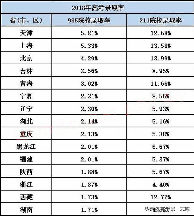 清华大学、北京大学这样的顶级高校,在河北省的录取与唐山学院这样没硕士点本科院校录取是同一批次。呵呵了。下图是2108年部分省份985和211院校录取率,对比前面的一本录取率,感觉如何?