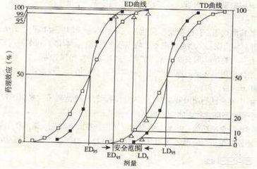 药物的安全范围指的是药物最小有效量与最小中毒量之间的范围,一般安全范围越大,用药越安全。药理学用上95%有效剂量(ED95)到5%中毒剂量(LD5)的距离表示。下图是我们临床药理学书上的图。