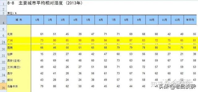 网上找的资料,2013年广州评价湿度是81,昆明是68