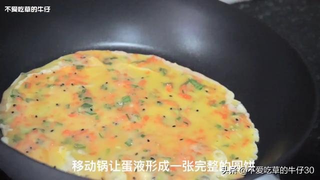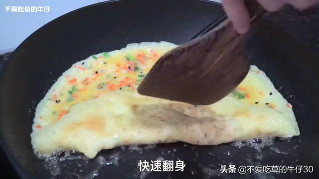 3. 晃动锅,让鸡蛋液形成一张完整的饼皮,可以整张晃动时,快速翻面,接着再倒鸡蛋液,一层一层卷起来,出锅前加热下侧面让鸡蛋卷熟透。