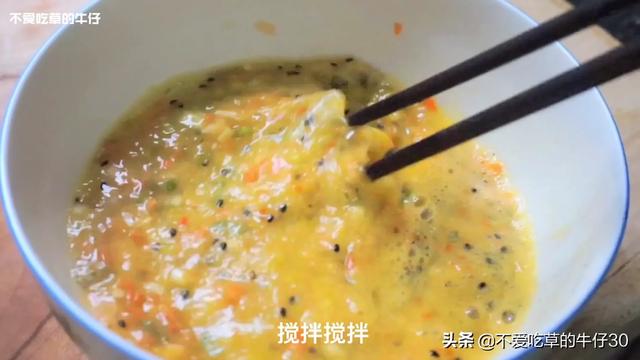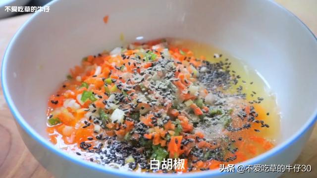 食材和调味:鸡蛋4-5颗,适量胡萝卜、青椒、大葱、黑芝麻、胡椒粉和盐。食材不限定,可根据自己的喜好来搭配。