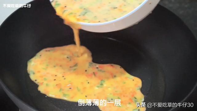 2. 在不粘锅内倒油烧热转小火,倒入搅拌均匀的鸡蛋液,不要太多,薄薄的一层刚好。