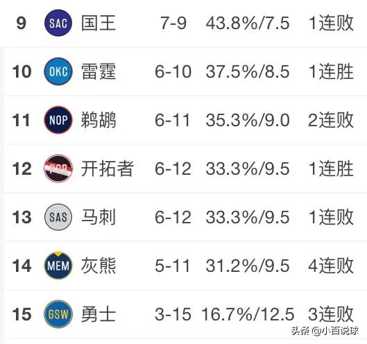 排名9-15位:国王、鹈鹕、开拓者、马刺、雷霆、灰熊、勇士;