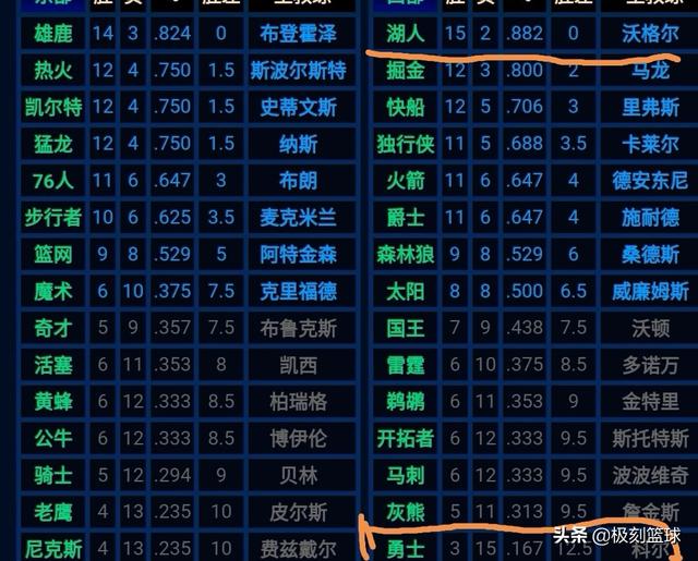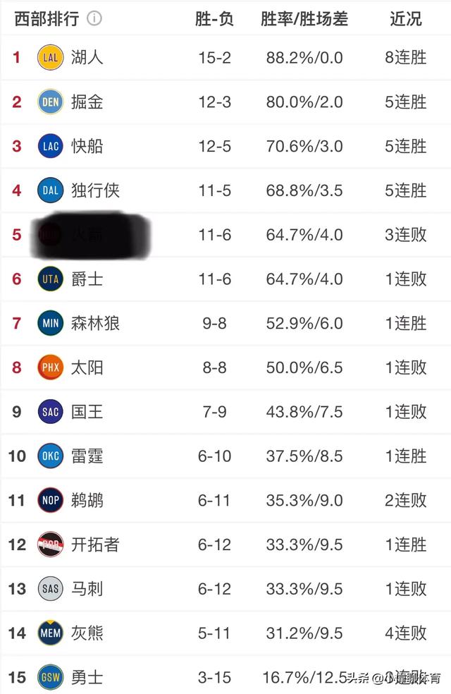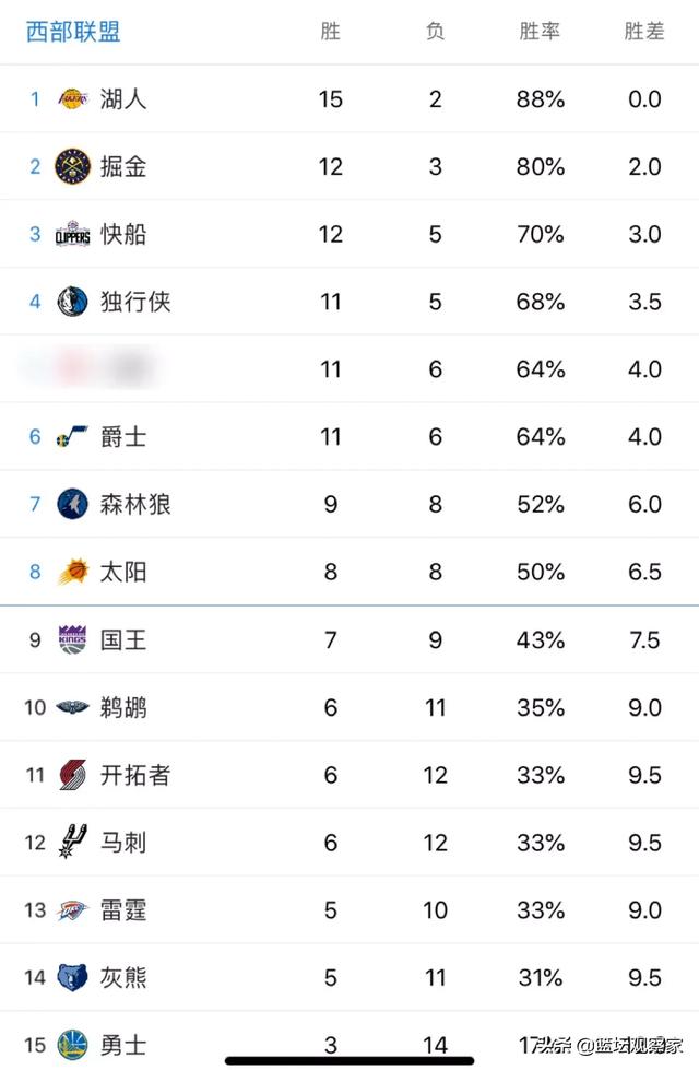 11月16日比赛结束,西部的形式渐渐明朗起来,湖人第一的王座越来越稳但残酷的12月也越来越近,开拓者一场胜利过后直接越过两个排名从第14跃到第12看来季后赛还有戏,而勇士则朝着摆烂的目标继续前进,目前以3胜15负联盟垫底,可谓为争状元签足够拼命。