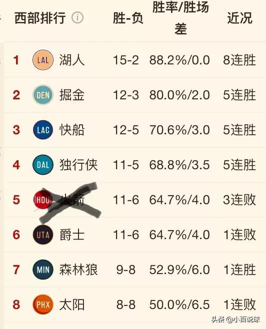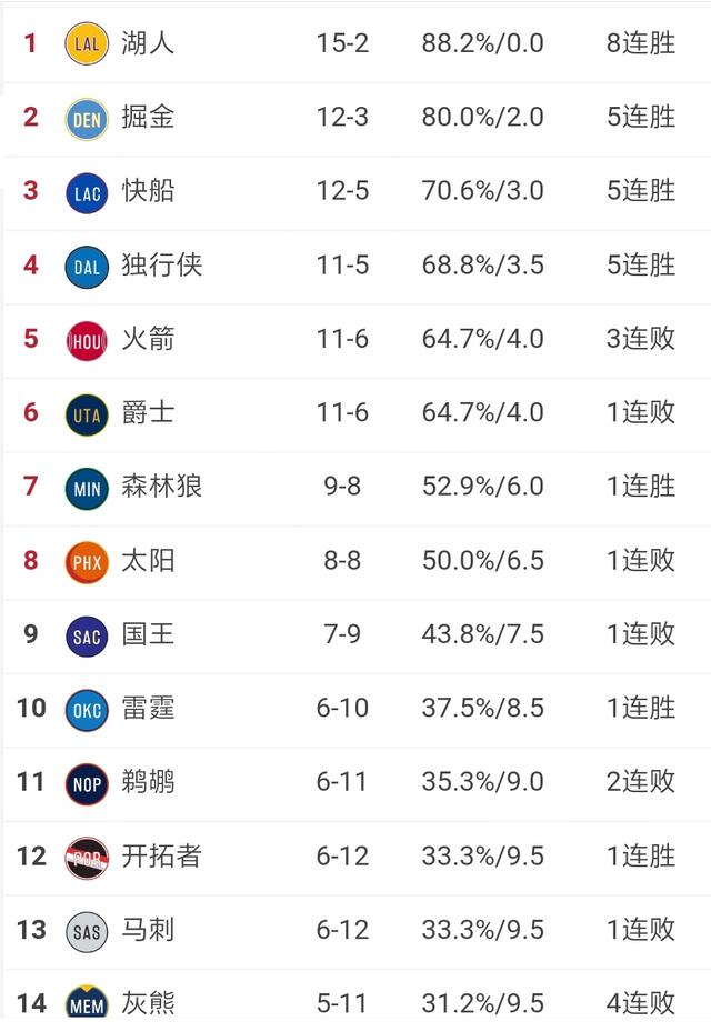 湖人队在战胜马刺后,他们以15胜2负的成绩继续巩固自己的排名优势,第二位的掘金也有不少的优势,目前还是没有什么危险,第三位的快船以及第六位的爵士都没有什么保障,一不小心就可能互换位置,7,8,9位的森林狼,太阳和国王的排位也不稳定,随时都有可能跌出前八,至于第10位到15位的这几支球队目前也很难爬到西部第八位。