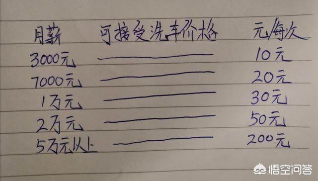 简单打听了一下身边不同薪资的消费人群,对洗车价格的接受程度。月薪3000元的人一般最高也就能接受十元每次的洗车费用,超过15元就会选择加油免费洗车或者自己洗。月薪7000元的人最高可以接受平常20元每次的洗车费用。月薪1万元的人可以接受平均每次30元的洗车费用,月薪两万元的人一般可以接受50元每次的精洗,月薪5万以上的人汽车也普遍比较昂贵,一般不会去路边小店洗车,大部分都上固定的俱乐部或者精洗店洗车,这种洗车店每次的洗车费用高达一二百元。
