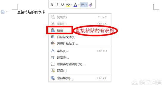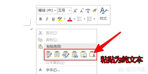 Step2:切换到Word窗口,点击鼠标右键,在填出的菜单中可以看到【粘贴选项】,在这些选项中,我们可以选择将复制的表格数据粘贴为多种形式,我们选择最后一个选项【只保留文本】,即可将表格去掉。